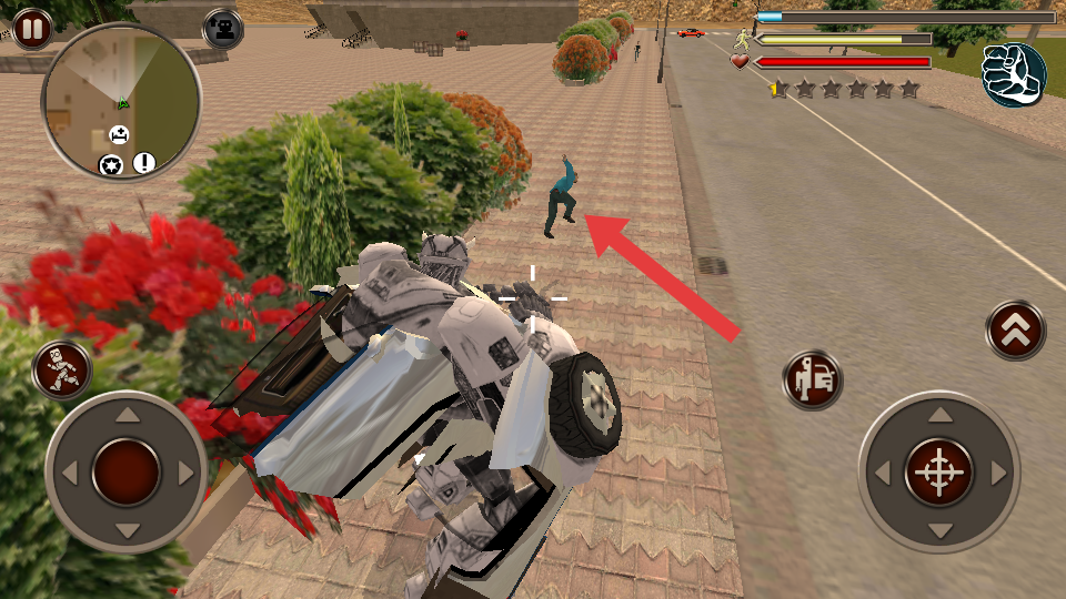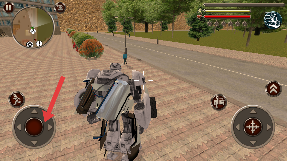1、進(jìn)入游玩的頁面操控機器人在城市街道移動,左側(cè)搖桿控制方向,遇到行人、車輛可互動,熟悉基礎(chǔ)移動與交互。
