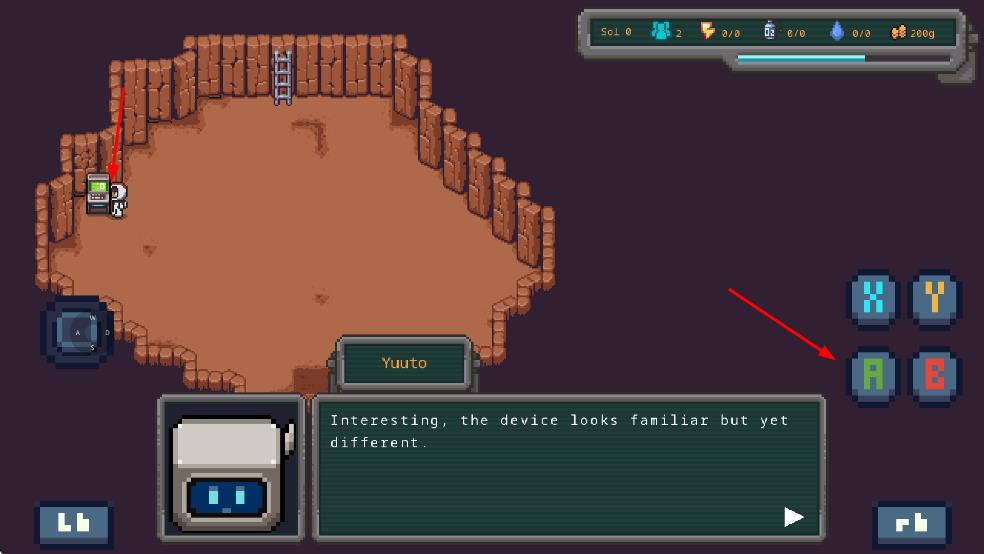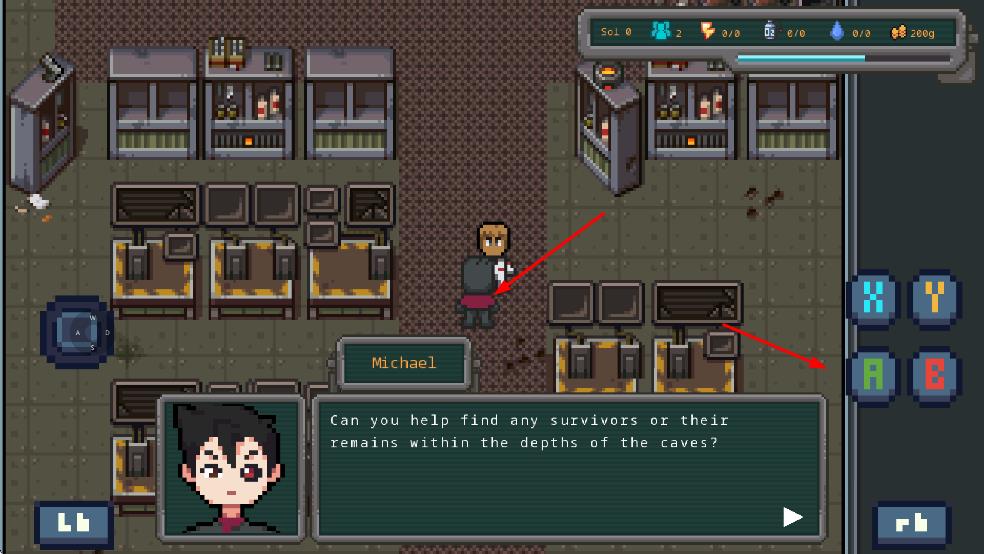 1、角色控制與互動:通過左方按鈕操控角色在火星表面移動,找到索拉娜等關(guān)鍵角色后,點(diǎn)擊A按鈕與其對話,獲取氧氣機(jī)等設(shè)施的設(shè)計(jì)圖,為后續(xù)建造奠定基礎(chǔ)。