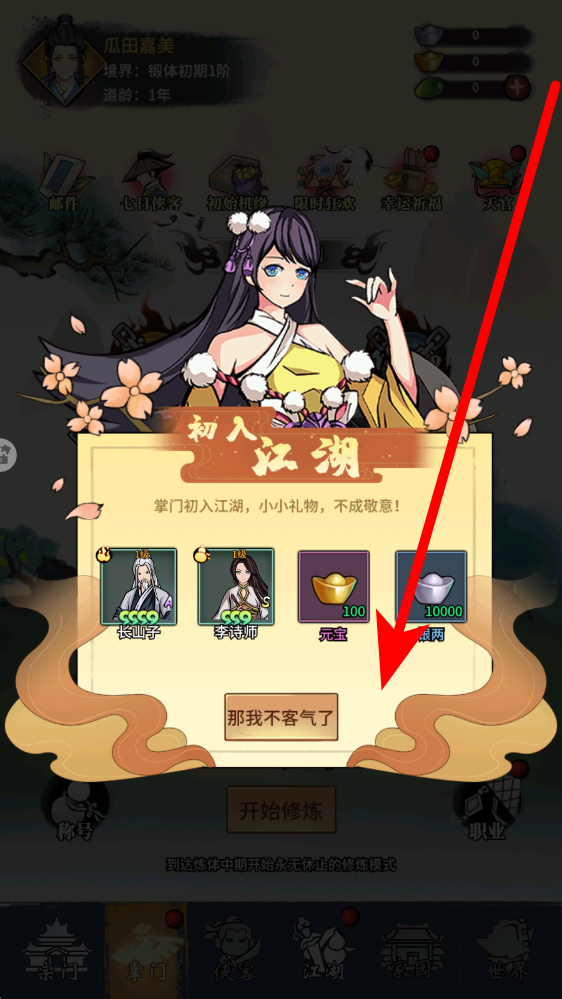 2、進入主界面以后,遇到初入江湖禮包彈窗,點擊那我不客氣了,領取長山子、李詩師等俠客及元寶、銀兩獎勵,為開局積累資源。