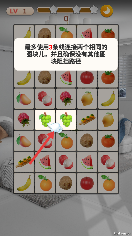 1、進入游戲后選擇關卡,屏幕將呈現(xiàn)滿屏圖案,點擊一個圖案后,找到相同且連線不超過三條直線的圖案,點擊即可消除并獲取少量金幣。