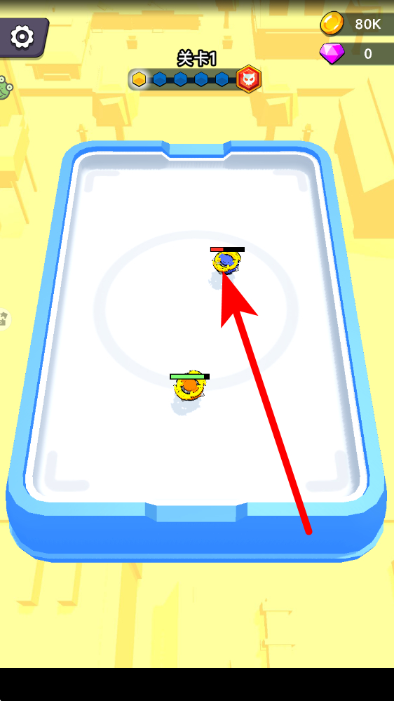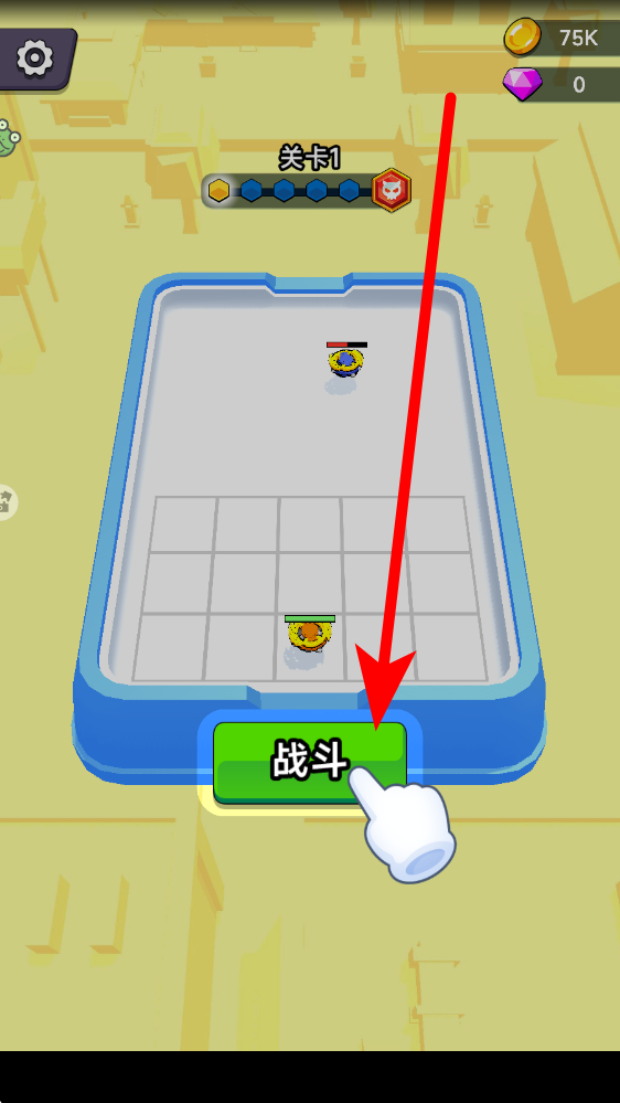 1、進(jìn)入應(yīng)用,在關(guān)卡界面點(diǎn)擊戰(zhàn)斗按鈕,選擇關(guān)卡1開啟挑戰(zhàn),操控己方陀螺,利用場地空間,向敵方陀螺發(fā)起進(jìn)攻,嘗試碰撞擊敗對手。