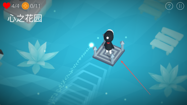 1、進入心之花園關卡,留意左上角紅心數(shù)量4/4與金幣數(shù)量0/11,操控角色按路線指示移動。