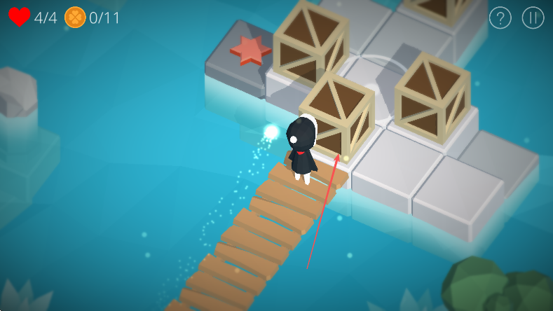 2、沿木橋前進,注意周圍環(huán)境,尋找像紅色五角星這樣的目標物品,同時避免角色掉落。