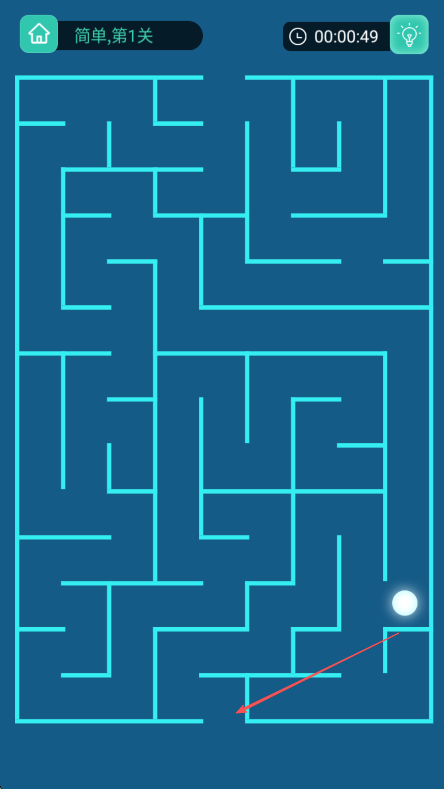 3、持續(xù)探索,避開死路,朝著迷宮出口前進(jìn),盡量在短時(shí)間內(nèi)完成關(guān)卡,像00:00:49時(shí)爭(zhēng)取接近或抵達(dá)出口。