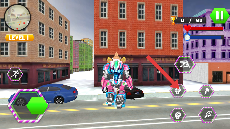 1、操控機(jī)器人在城市街道移動(dòng),點(diǎn)擊右側(cè)技能按鈕如拳頭、火箭圖標(biāo),發(fā)起攻擊的關(guān)鍵操作,點(diǎn)擊可打擊目標(biāo)。