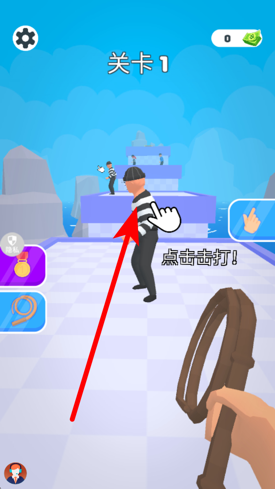 1、進(jìn)入游戲后,在關(guān)卡場(chǎng)景中,看到目標(biāo)角色穿著條紋服裝的角色,根據(jù)提示點(diǎn)擊擊打,對(duì)其發(fā)起攻擊,擊敗后可以繼續(xù)前進(jìn)。