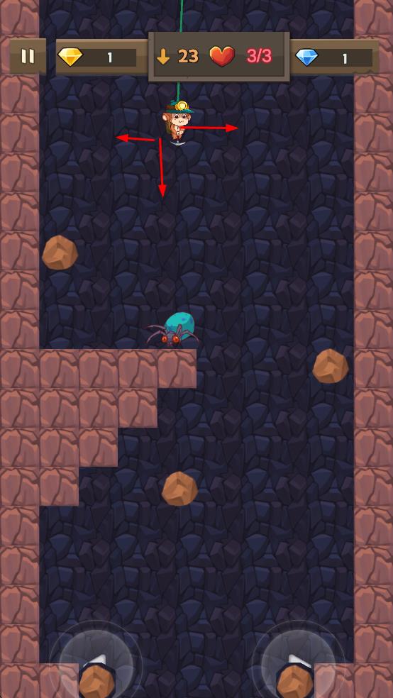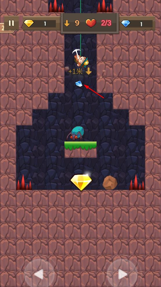 2、操控角色左右移動,躲避蜘蛛等敵人,在向下挖掘的過程中,收集藍色鉆石、黃色鉆石等資源,同時留意生命值愛心標識,避開尖刺等危險障礙。