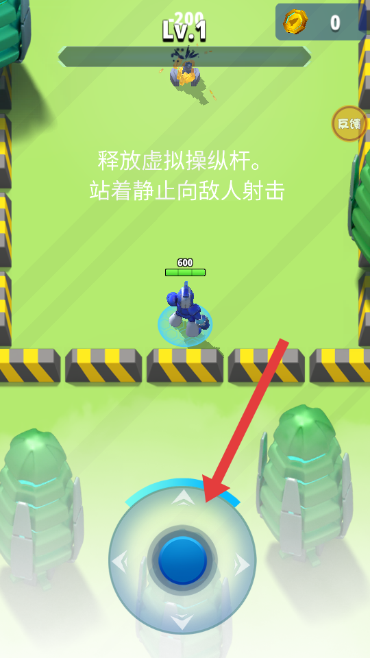1、游戲初期,釋放虛擬操縱桿,讓藍(lán)色機(jī)甲站定靜止,向敵方單位射擊,利用初始站位精準(zhǔn)打擊上方敵人。