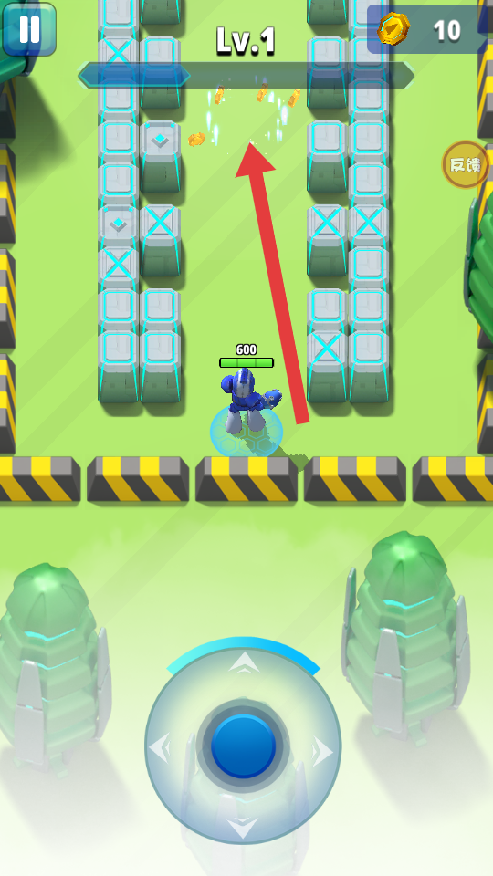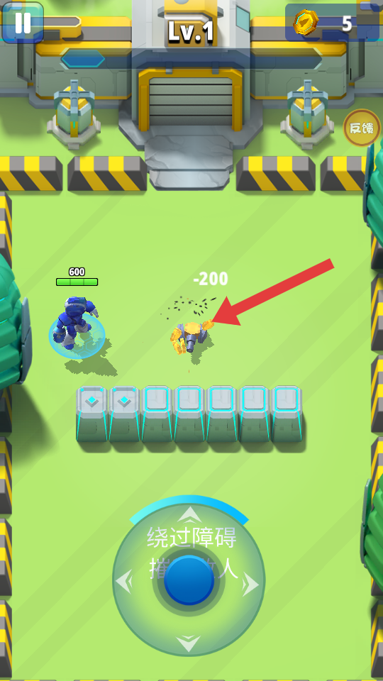 2、遇到帶有障礙的場景時,通過虛擬操縱桿操控機(jī)甲移動,再瞄準(zhǔn)敵人攻擊,同時可收集擊敗敵人掉落的金幣。