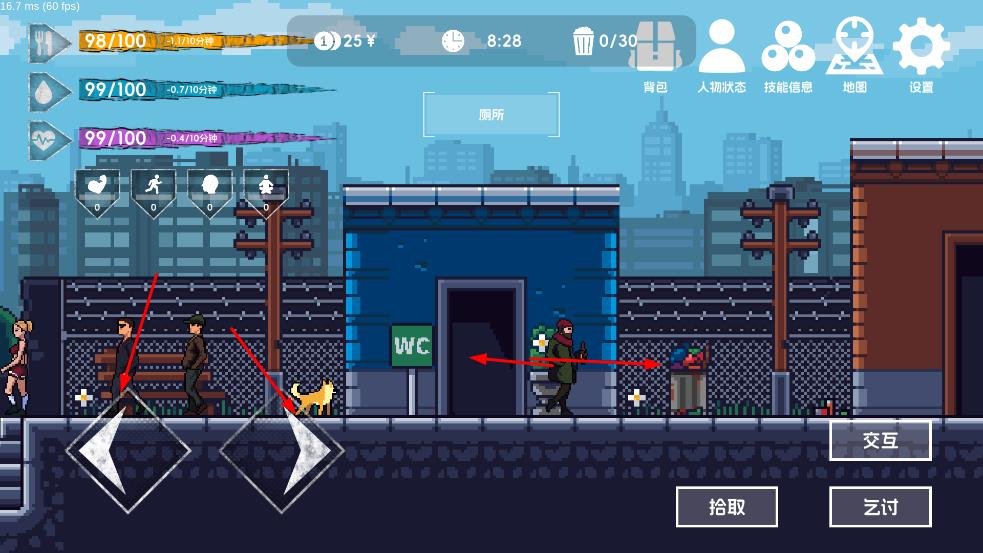 1、操控角色左右移動(dòng),在場(chǎng)景中對(duì)WC標(biāo)識(shí)處等地點(diǎn)進(jìn)行交互,還可使用拾取乞討功能,同時(shí)留意人物的饑餓、水分、健康等狀態(tài)條。