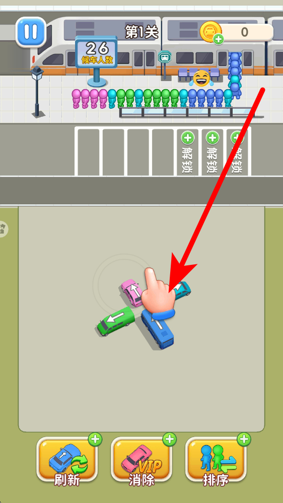 1、打開游戲后,在關(guān)卡場景中,會看到多輛停放的車輛,需觀察車輛的位置與可移動方向,通過點(diǎn)擊等操作,移動車輛,為目標(biāo)車輛開辟道路。