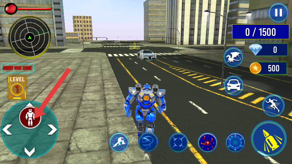 1、開局看左側(cè)設(shè)虛擬搖桿,用于操控藍(lán)色機(jī)器人的移動方向;右側(cè)配備火箭、龍形態(tài)、汽車形態(tài)等功能的按鍵。