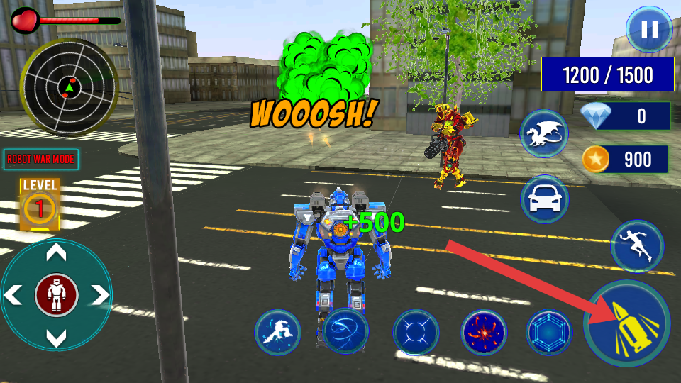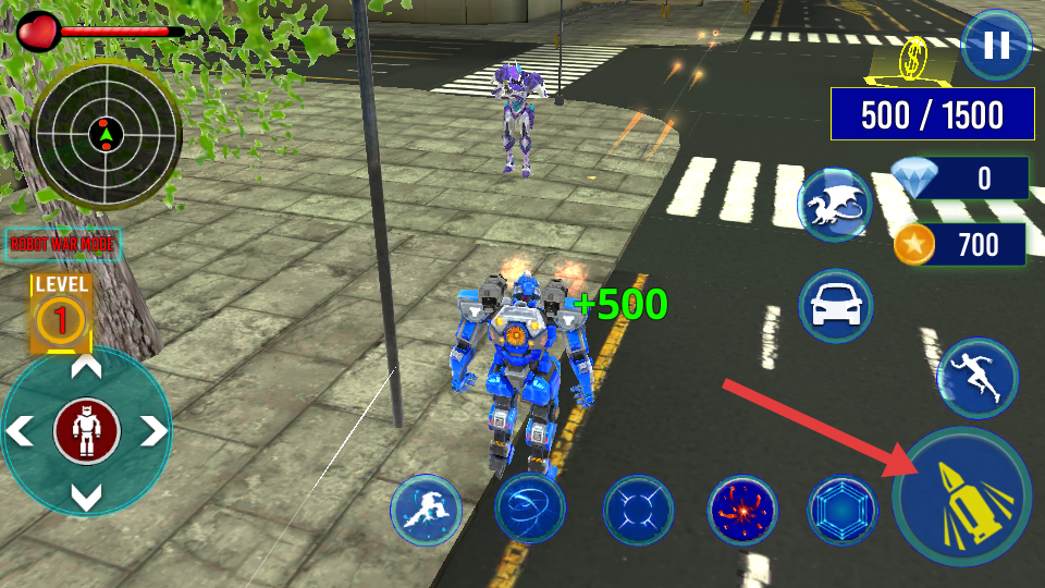 3、場景為現(xiàn)代城市的街道,包含高樓、車輛、樹木等;有藍(lán)色主角機(jī)器人或者紅色敵對機(jī)器人,按火箭按鍵攻擊。