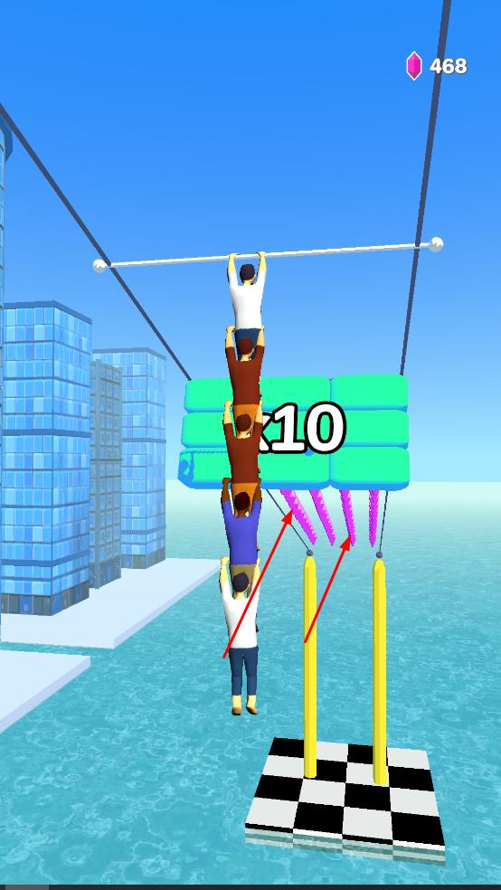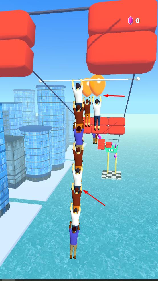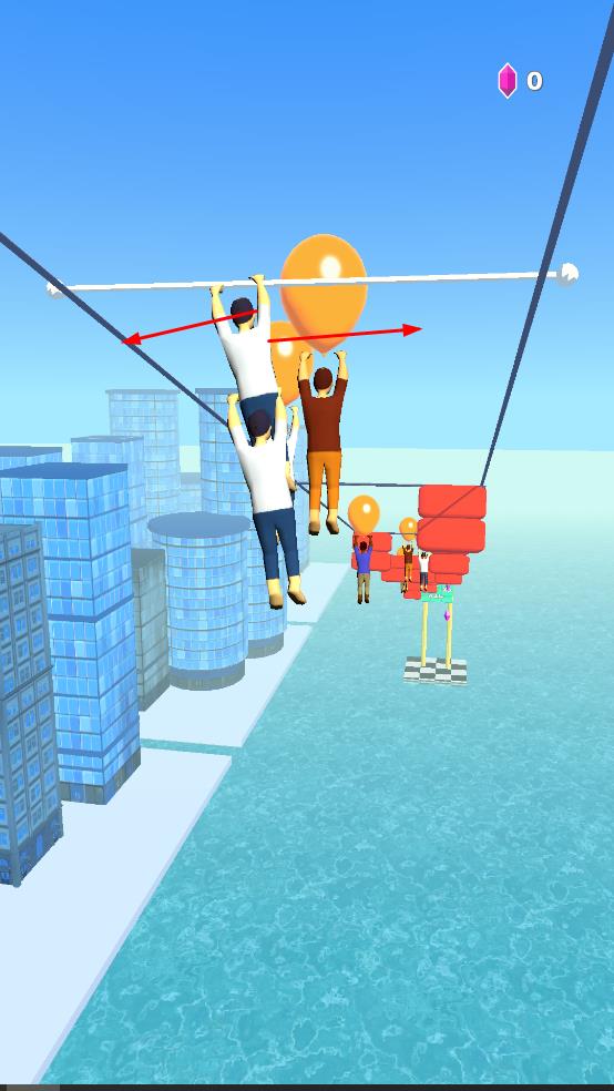 1、進入游戲后,操控角色在城市背景的繩索上左右移動,收集氣球等道具,還可與其他角色堆疊,增加整體長度。