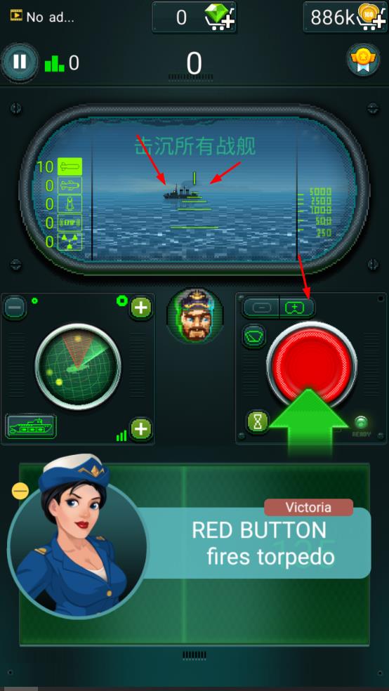1、進入游戲后在潛艇操控界面,依據(jù)提示點擊紅色按鈕發(fā)射魚雷,目標是擊沉所有戰(zhàn)艦,開啟海戰(zhàn)任務(wù)。