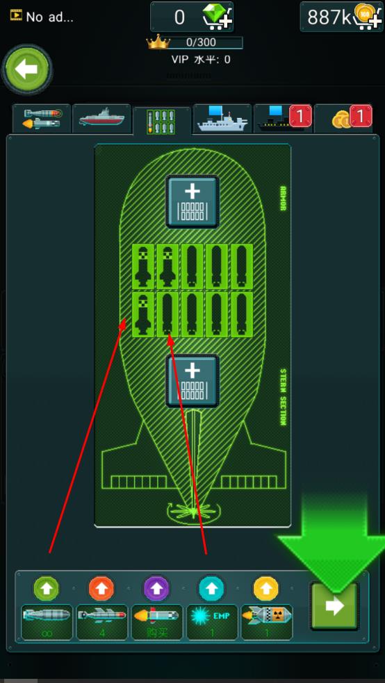 3、戰(zhàn)斗間隙可進入潛艇內(nèi)部界面,查看魚雷等武器配置,還能開展武器升級等操作,強化潛艇戰(zhàn)力。