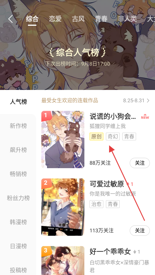 2、篩選心儀漫畫:根據(jù)自身喜好在各分區(qū)篩選漫畫,可優(yōu)先查看日更榜單或原創(chuàng)推薦,點(diǎn)擊漫畫封面查看詳情,確定想要閱讀的高品質(zhì)作品。