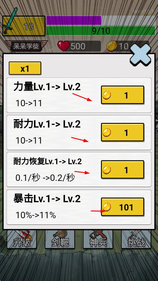 1、進(jìn)入升級(jí)界面,消耗金幣提升力量、耐力等屬性,從Lv.1升至Lv.2,增強(qiáng)角色戰(zhàn)力,為戰(zhàn)斗與訓(xùn)練奠定基礎(chǔ)。