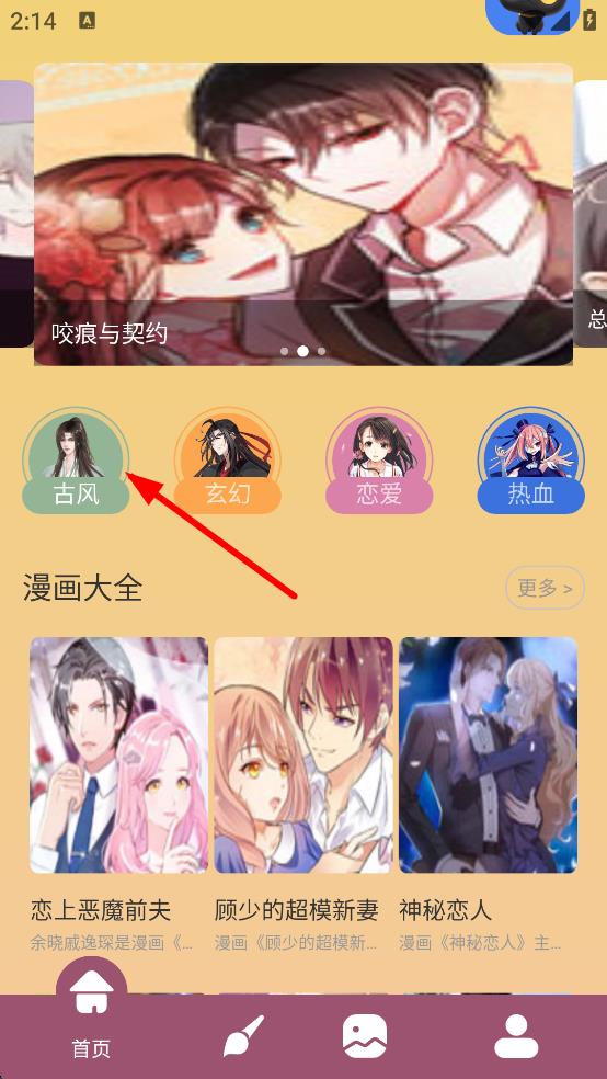 1、在首頁,點擊古風(fēng)分類,進入古風(fēng)漫畫頁面。
