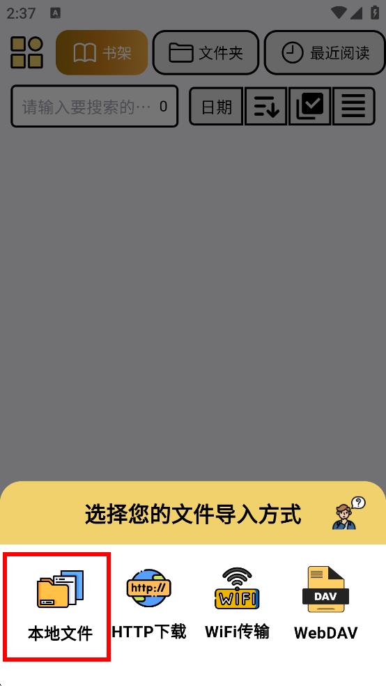 1、在書架頁(yè)面,點(diǎn)擊右下角帶加號(hào)的文件圖標(biāo),彈出文件導(dǎo)入方式選擇框。