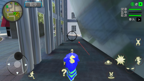 2、在城市中移動(dòng)時(shí),點(diǎn)擊右側(cè)類似跳躍、飛行等功能按鈕,可實(shí)現(xiàn)快速移動(dòng),還能利用這些技能穿梭于建筑間。