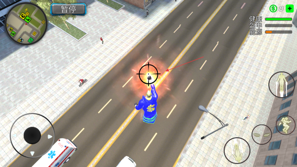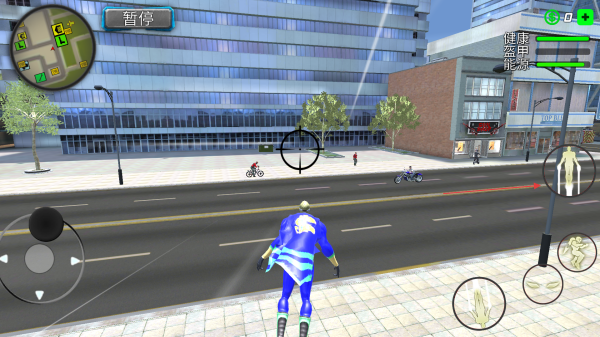 1、超人能力懲惡操作:玩家操控超人在城市中飛行,發(fā)現(xiàn)犯罪分子后,可發(fā)射激光束進(jìn)行遠(yuǎn)程攻擊,若敵人靠近則啟用念力控制將其束縛,避免其逃脫,完成懲惡任務(wù)獲取獎(jiǎng)勵(lì)。