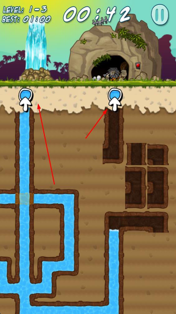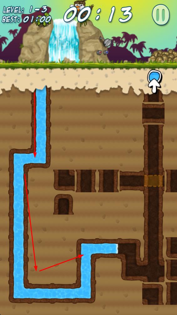 1、進入關(guān)卡如1-3后,規(guī)劃水渠路徑,引導(dǎo)瀑布水流向目標(biāo)出口,挖掘土壤開辟通水通道,為后續(xù)連通打基礎(chǔ)。