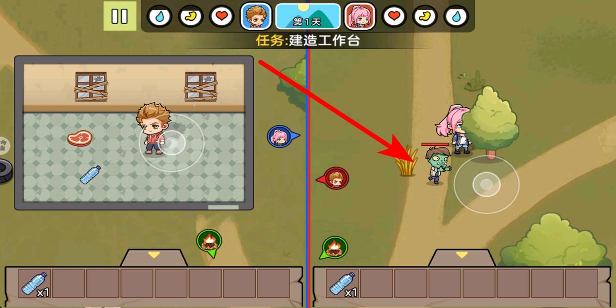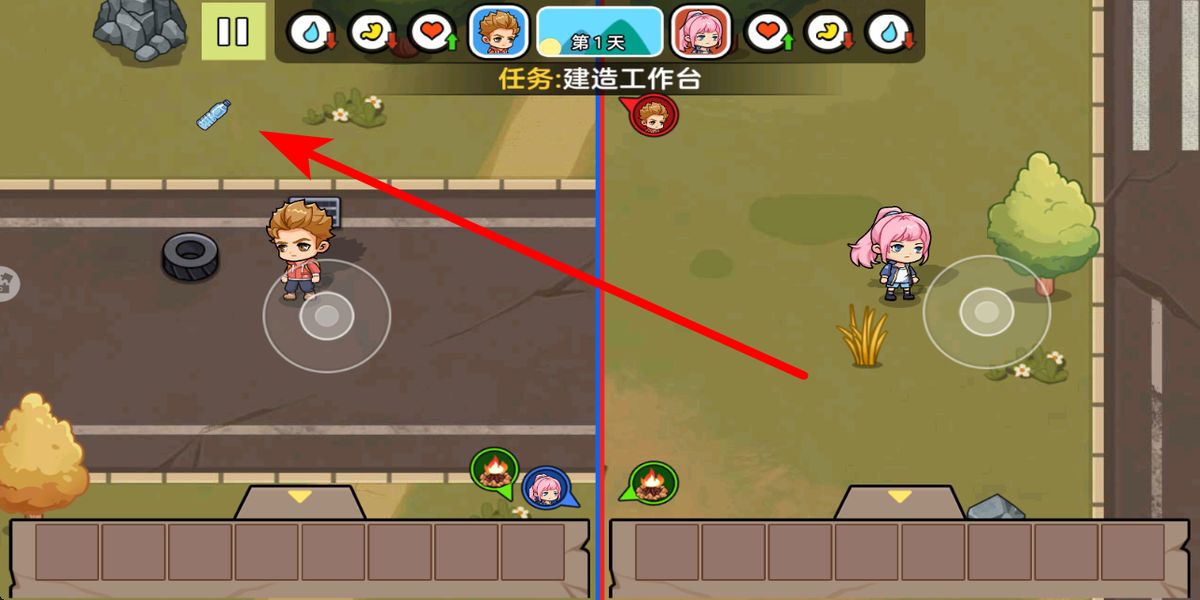 2、進入場景后,兩名玩家可分頭或一同在場景中尋找物資,像散落的水瓶等物品,靠近后可收集這些物資,為后續(xù)生存與建造提供資源支持。