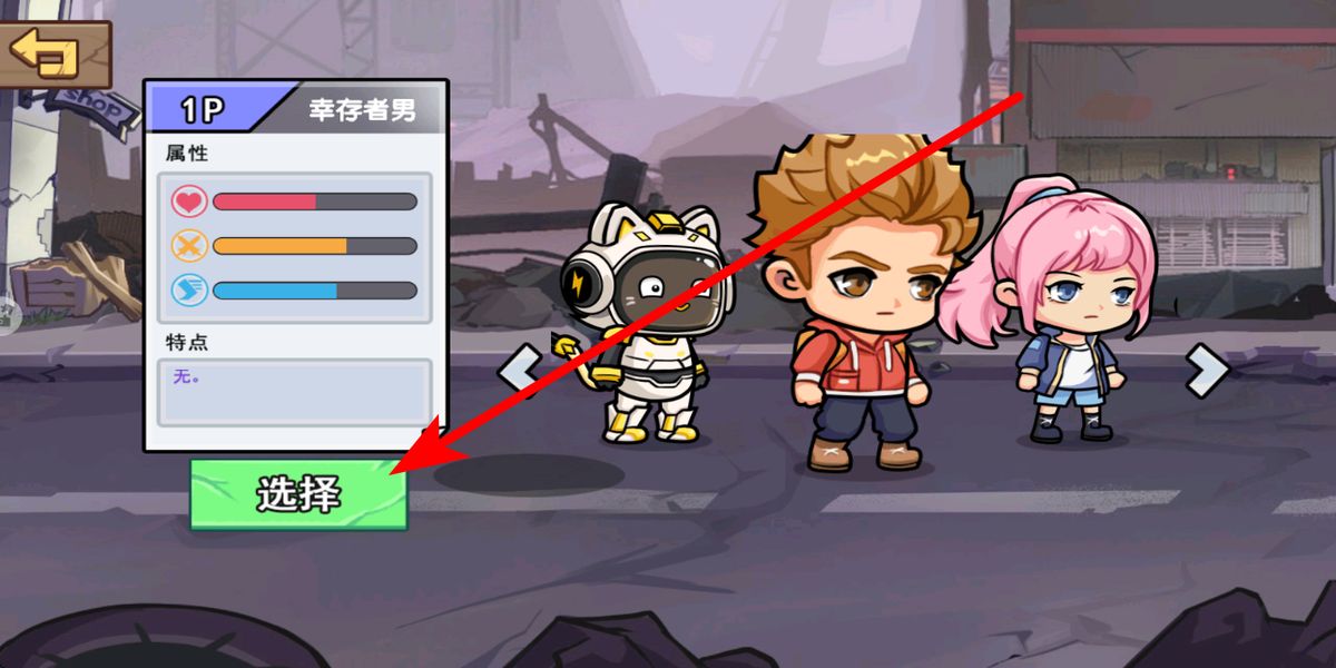 2、角色選擇界面,看到不同的角色,比如帶有屬性展示的幸存者男等,挑選好想要操控的角色后,點擊選擇,便可確定角色,進入求生場景。
