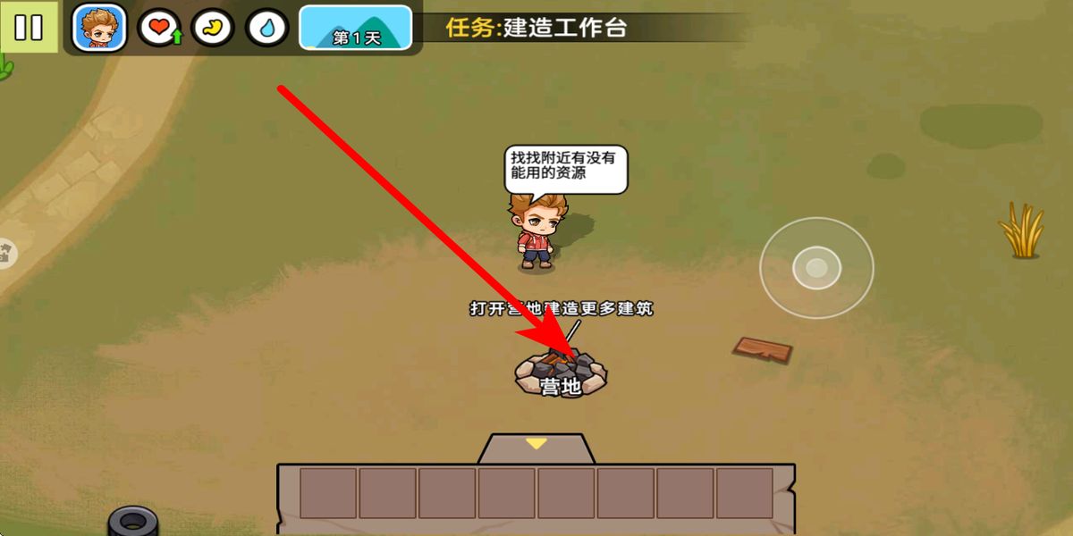 3、進入場景后,根據(jù)提示尋找附近能用的資源,點擊營地標識,打開營地建造界面,進而建造更多建筑,為在末日中長久生存打造基礎設施。