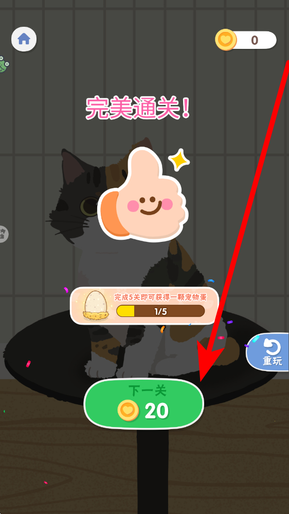 3、成功完成小貓清洗后,界面會顯示通關提示,同時出現(xiàn)領取獎勵的選項,點擊該選項,就能獲得相應的獎勵,繼續(xù)體驗更多趣味互動。