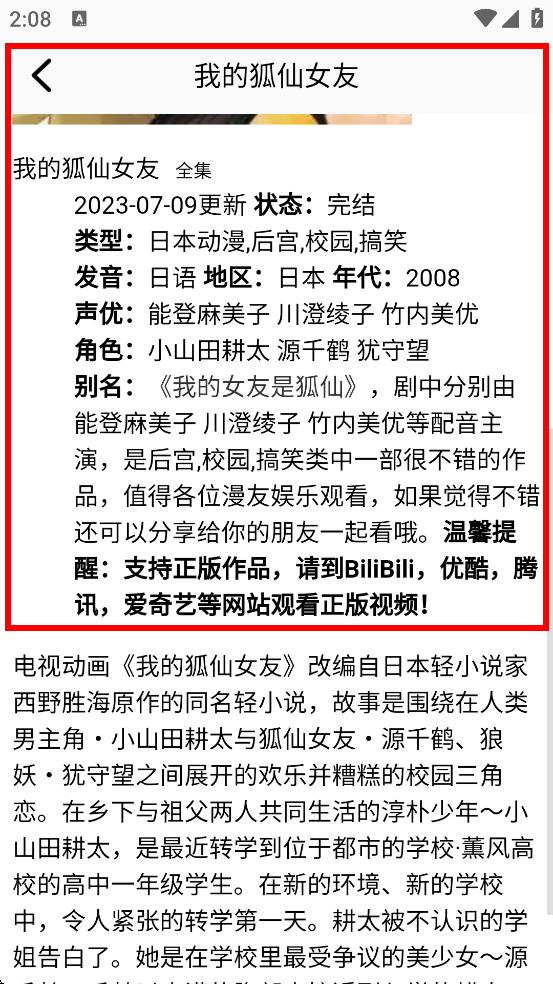 3、進(jìn)入詳情頁,可查看該動漫的更新時(shí)間、類型、聲優(yōu)等信息。