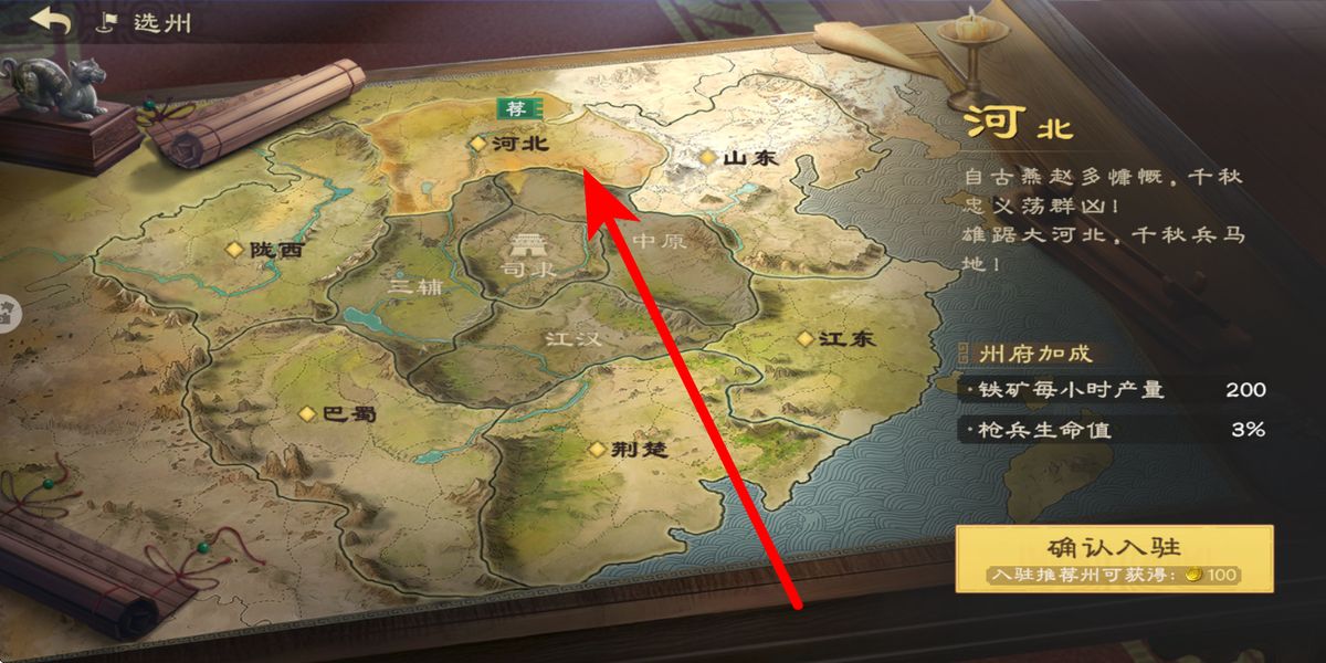 1、進入游戲后,上面有不同的州可供選擇作為出生地,比如河北等,每個州都有對應的資源加成等特點,挑選合適的州,點擊確認入駐,確定出生地。