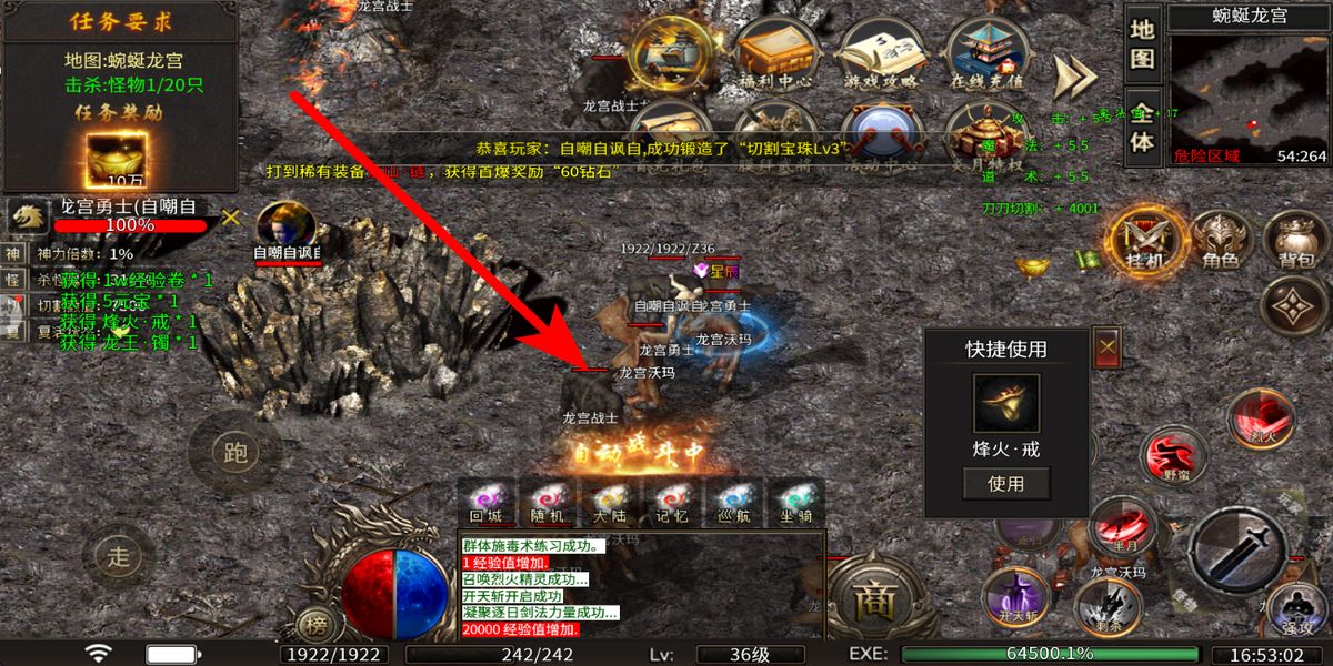 3、進(jìn)圖打怪進(jìn)入地圖蜿蜒龍宮,按任務(wù)殺怪,用快捷道具烽火戒,借助自動(dòng)戰(zhàn)斗,獲取經(jīng)驗(yàn)、裝備推進(jìn)游戲體驗(yàn)進(jìn)程。