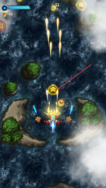 2、在飛行過程中,注意收集畫面中的金幣和道具,如箭頭所指的金色道具,提升戰(zhàn)機屬性或獲取特殊能力。