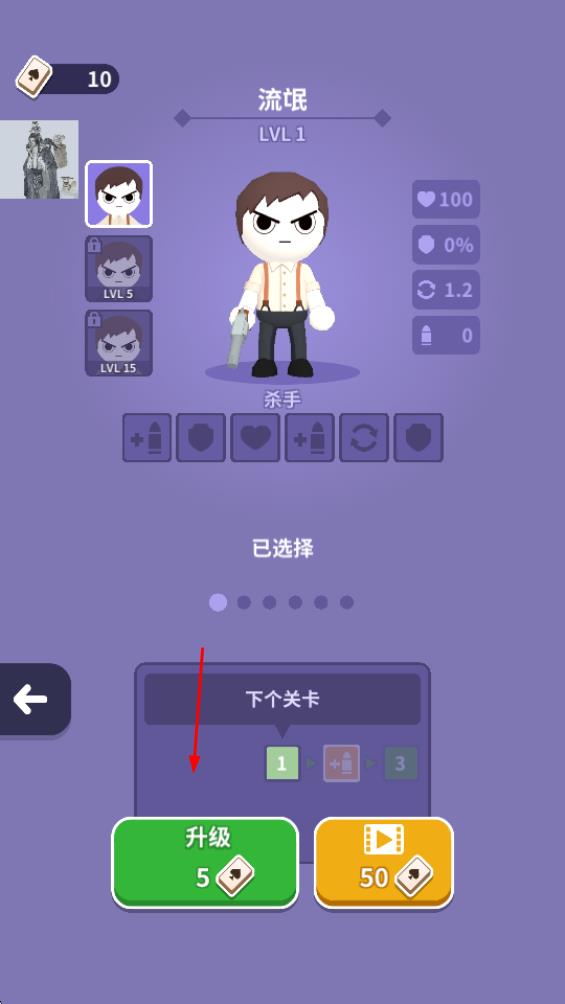 1、在角色界面,選擇流氓等角色,花費(fèi)對(duì)應(yīng)道具進(jìn)行升級(jí),提升生命值、攻擊相關(guān)屬性,為戰(zhàn)斗筑牢基礎(chǔ)。