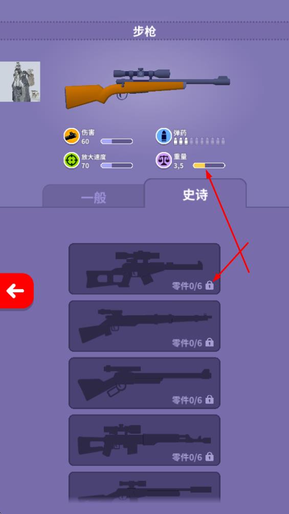 2、進(jìn)入武器界面,查看步槍的傷害、放大速度等屬性,收集零件解鎖更高級(jí)武器,強(qiáng)化射擊能力。