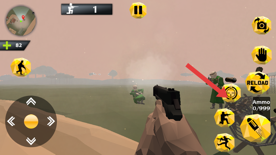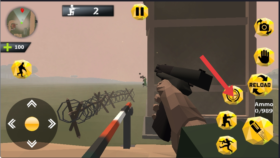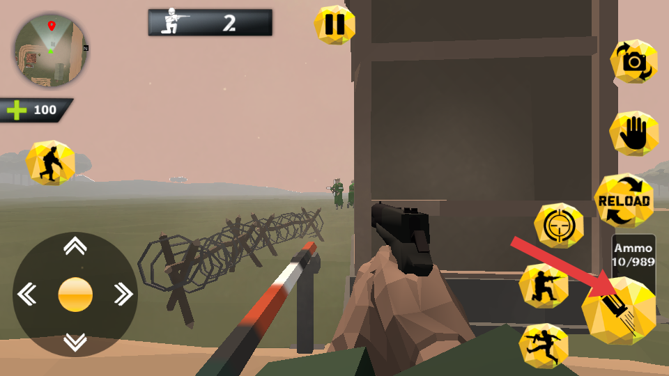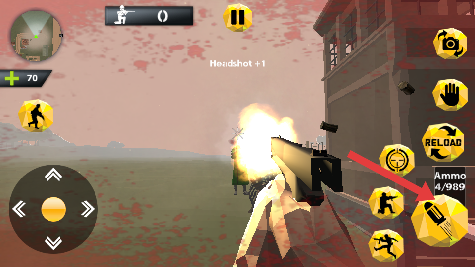 2、關(guān)注彈藥量,界面顯示RELOAD時,及時點擊按鈕換彈,在交火中因彈藥不足陷入被動,同時留意生命值,尋找安全區(qū)域恢復(fù)。