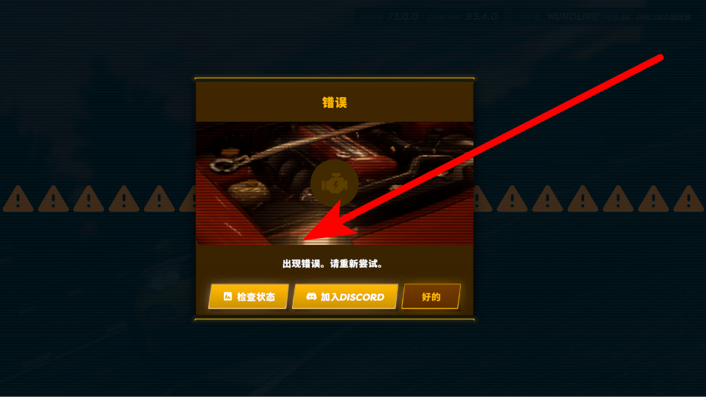2、若注冊過程中出現(xiàn)錯誤提示,界面會彈出出現(xiàn)錯誤,請重新嘗試的窗口,此時可根據(jù)情況選擇檢查狀態(tài)加入DISCORD或好的,之后重新進(jìn)行注冊或登錄操作。
