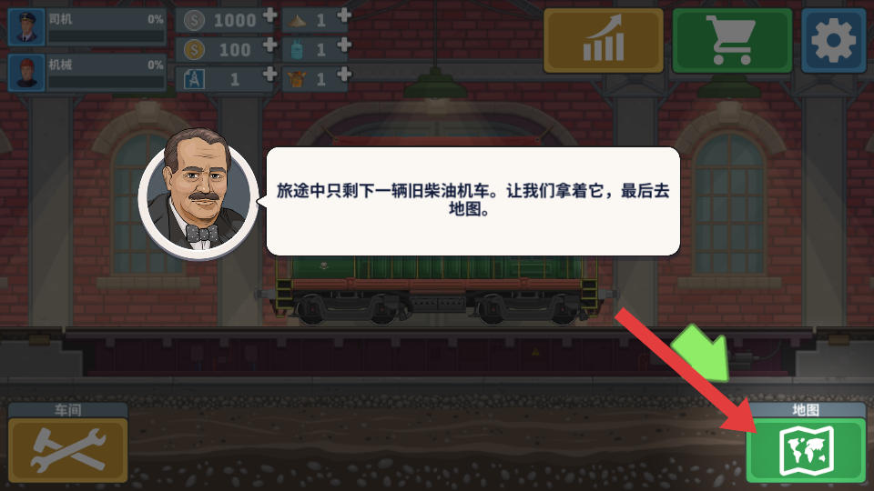 1、按照提示,選擇僅有的舊柴油機車,點擊“地圖”按鈕,開啟火車駕駛之旅,遵循游戲引導(dǎo)逐步進入駕駛環(huán)節(jié)。