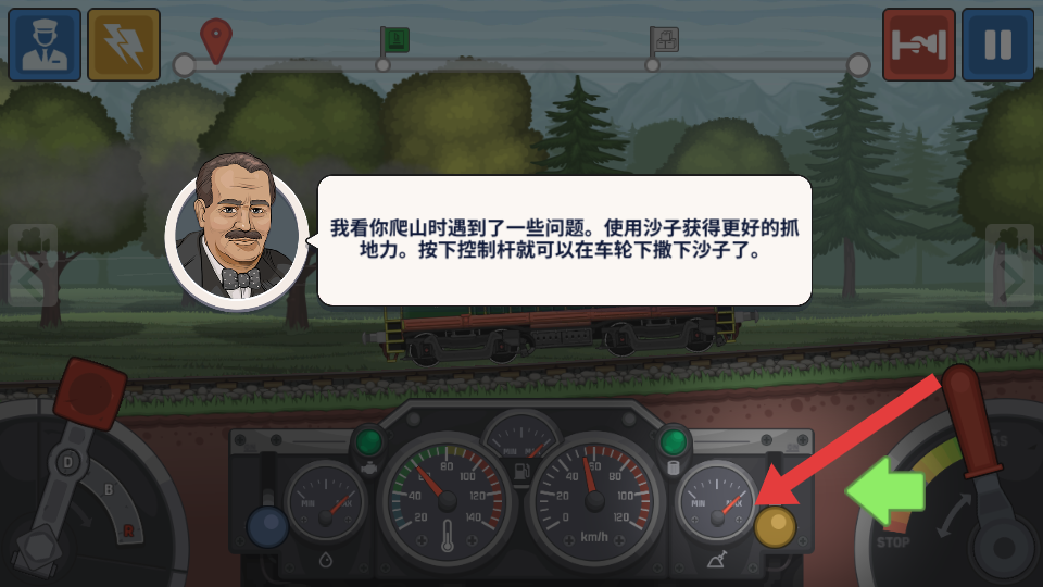 4、爬山遇到抓地力問題時,按下控制桿在車輪下撒沙子,以此獲得更好的抓地力,助力火車順利爬坡。