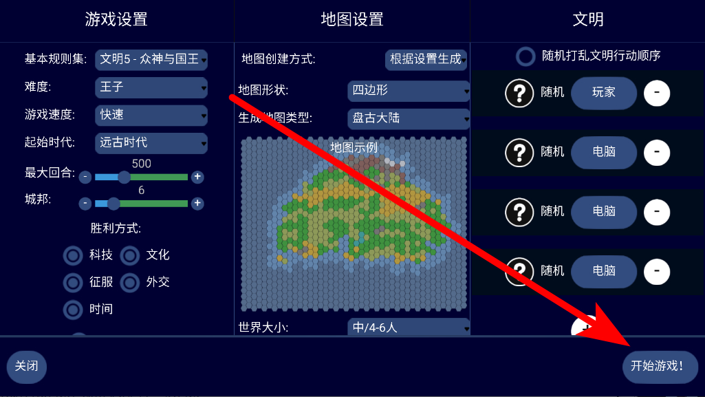 2、對基本規(guī)則集、難度、游戲速度、起始時代等參數(shù)進(jìn)行設(shè)置,形狀等地圖設(shè)置,以及選擇勝利方式,完成設(shè)置后開始游戲,進(jìn)入文明發(fā)展進(jìn)程。