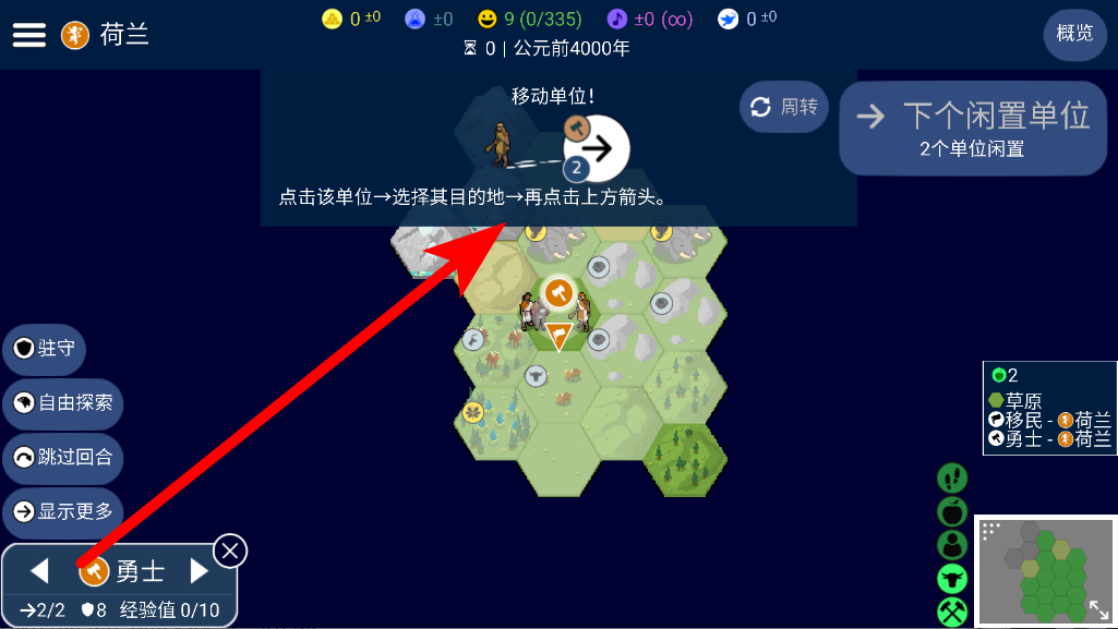 3、在游戲中,要移動單位時,點(diǎn)擊該單位,選擇其目的地,再點(diǎn)擊上方箭頭,即可操控單位移動,探索地圖,為文明發(fā)展開拓空間。