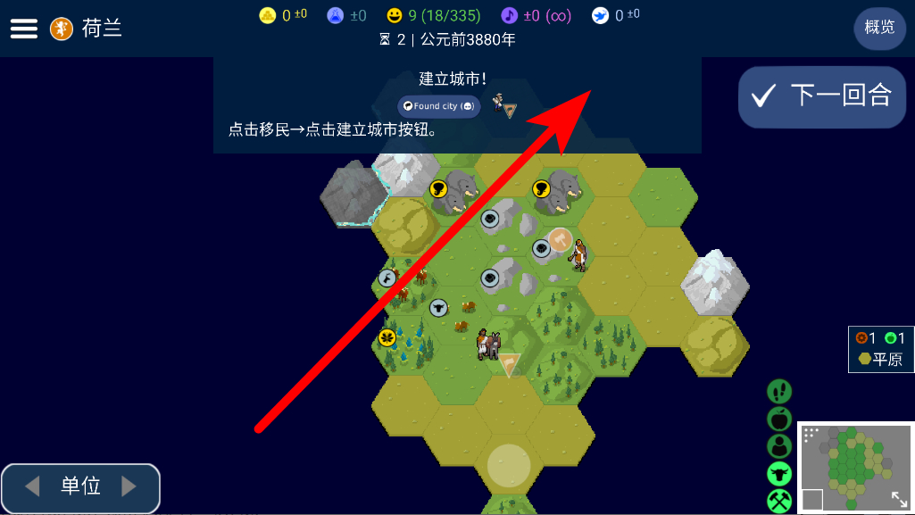 4、當(dāng)需要建立城市時,點(diǎn)擊移民,再點(diǎn)擊建立城市按鈕,就能在合適的位置建立城市,以此為基礎(chǔ),不斷發(fā)展文明,推進(jìn)游戲進(jìn)程。