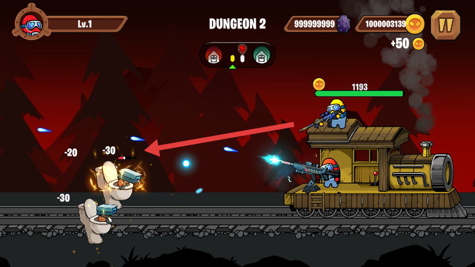 2、遇到馬桶造型的敵人時,用火車上的武器射擊它們,消滅這類敵人能獲取金幣的獎勵,積累資源。
