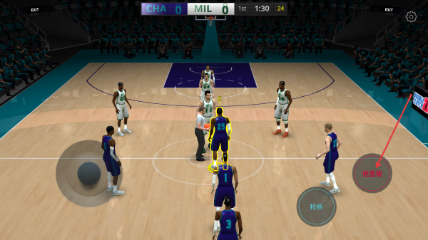 3、比賽開始,通過左下角的虛擬搖桿控制球員移動跑位,當出現(xiàn)球權爭奪時,點擊右下角的搶奪按鈕嘗試獲得球權。