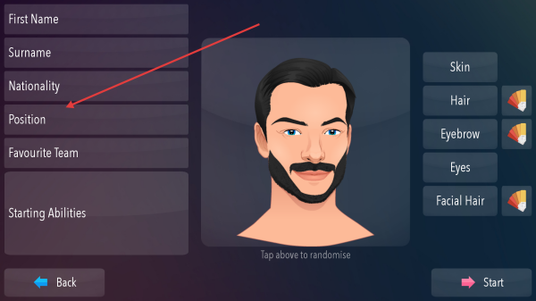 1、游戲初始,在角色創(chuàng)建界面,填寫名字、姓氏等信息,點(diǎn)擊Position選擇角色在球隊(duì)中的位置,還能通過(guò)右側(cè)選項(xiàng)調(diào)整膚色、發(fā)型等外觀。