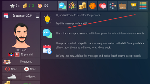 2、進(jìn)入游戲,查看消息界面提示,點(diǎn)擊消息將其刪除,游戲日期會(huì)向前推進(jìn)一周,借此熟悉游戲時(shí)間推進(jìn)機(jī)制。