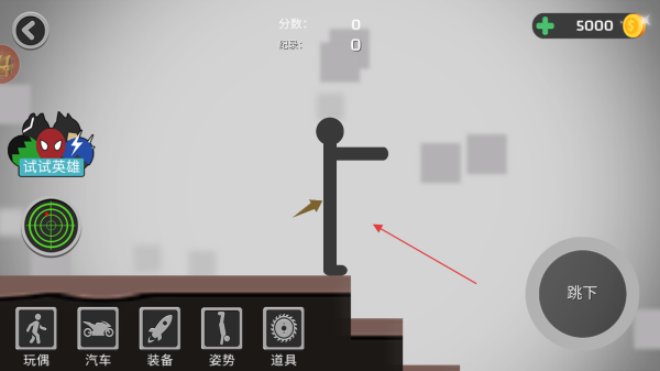 1、進(jìn)入游戲界面,查看右上角金幣數(shù)5000,點(diǎn)擊跳下按鈕讓火柴人開始行動(dòng)。