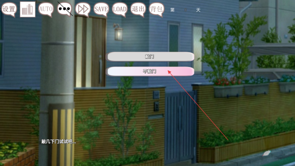 1、在游戲初始對(duì)話場(chǎng)景,面對(duì)選擇項(xiàng)時(shí),點(diǎn)擊敲門(mén)選項(xiàng),推進(jìn)劇情發(fā)展。